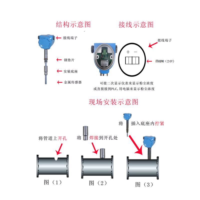 4、接线盒内置一体化变送器输出的4-20mA电流与粉尘感应探针之间电气隔离,实现信号的安全传输。